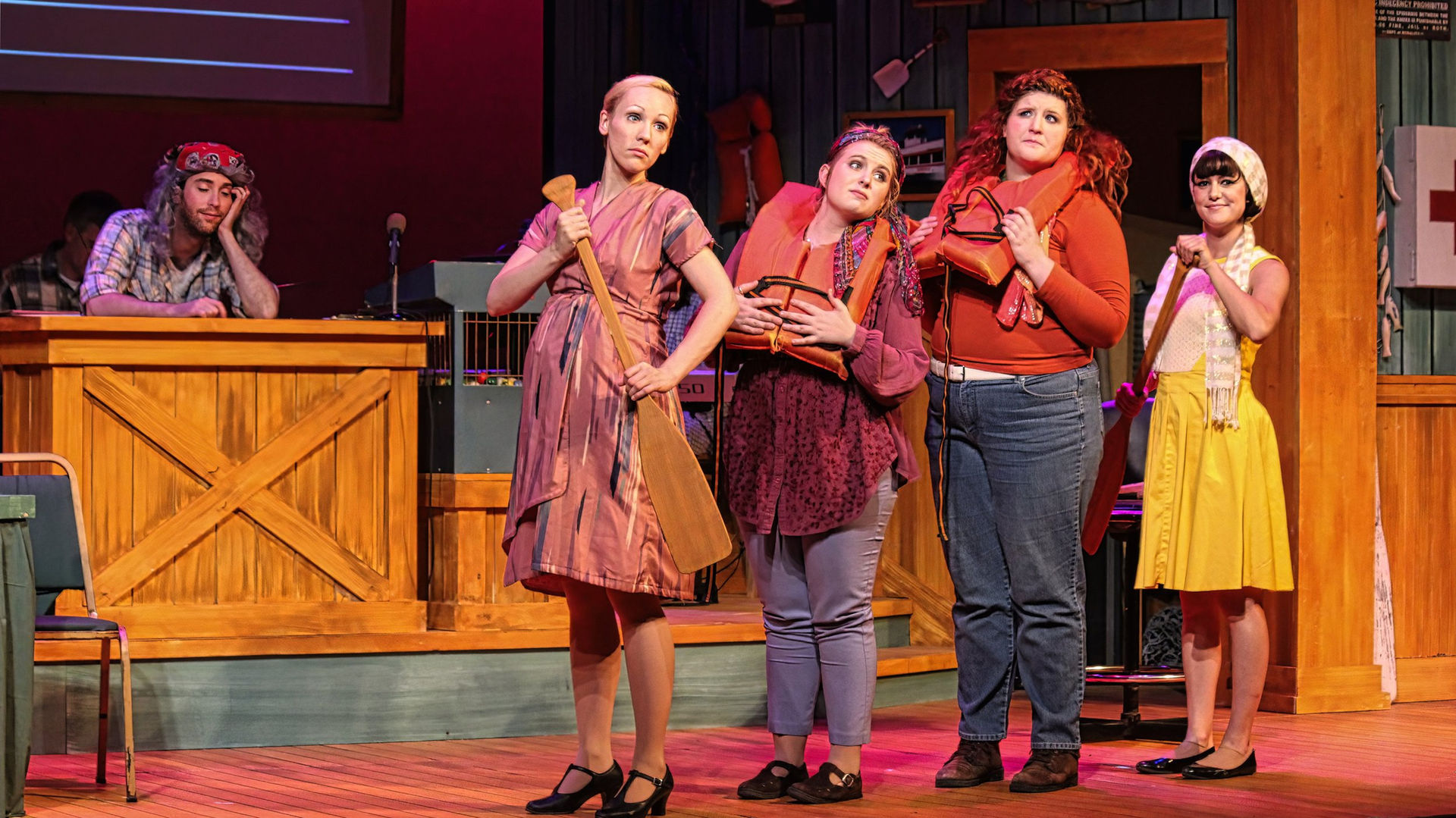 A playful nautical world for Okoboji Summer Theatre, using lakeside color, retail-comedy brightness, and musical-theatre clarity to support the show's fast humor and local charm.