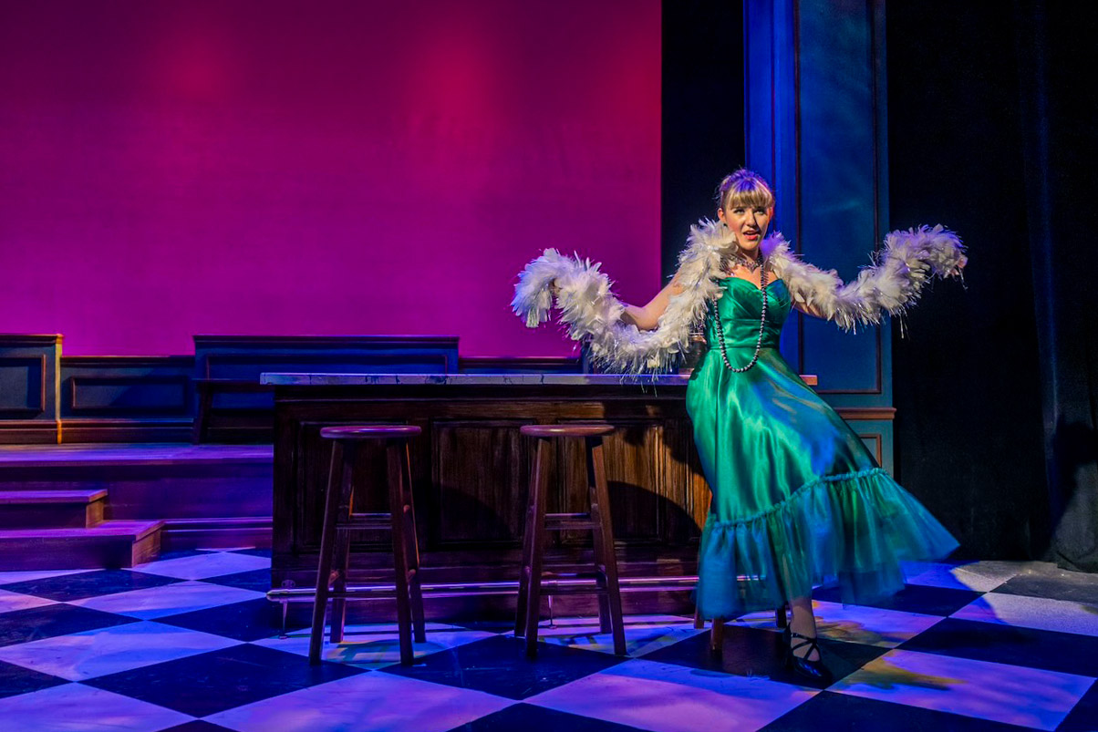 For Cole at Okoboji Summer Theatre, I wanted the audience to feel like they had stepped into a late-night room in the 1920s. Not a museum version of the jazz age, something alive. The foundation was a black-and-white tile floor, rich walnut millwork, and a grounded bar that anchored the room architecturally.