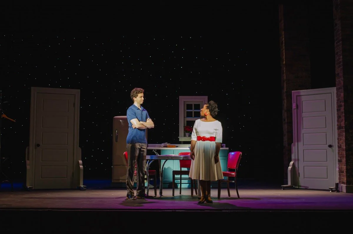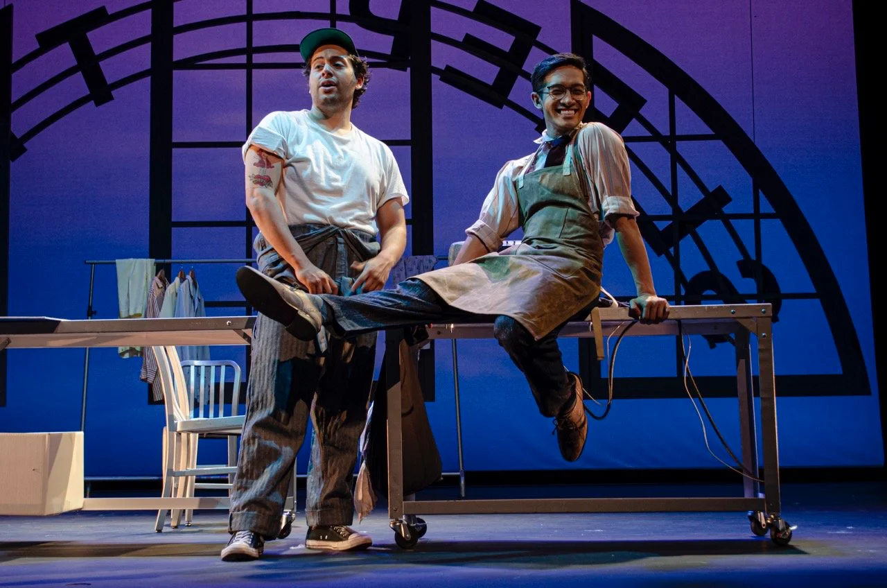 The story balances spirited romance with a sharp labor dispute, so the scenic world had to support both. Repeating structures and a vibrant factory palette suggested postwar optimism, while signage and movable units emphasized workplace mechanics and the conflict over fair wages driving the plot.