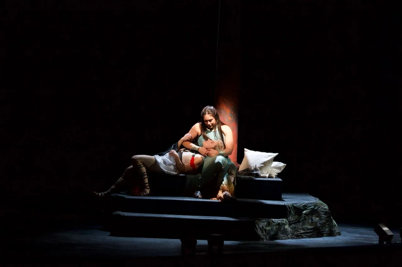 A central concern was chorus visibility. The scenic composition needed to support group presence without flattening the action, so the environment used open geometry and layered playing levels that could expand into epic framing or compress into intimate address. That flexibility allowed the production to move fluidly between narrative distance and emotional immediacy.