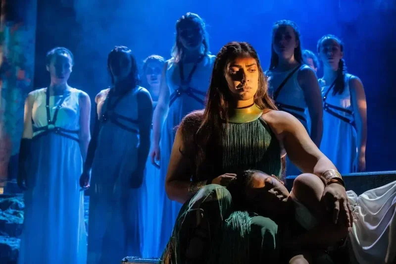A ritual memory space for The Penelopiad, where Penelope and the maids testify within the same visual architecture, balancing epic framing with intimate address.